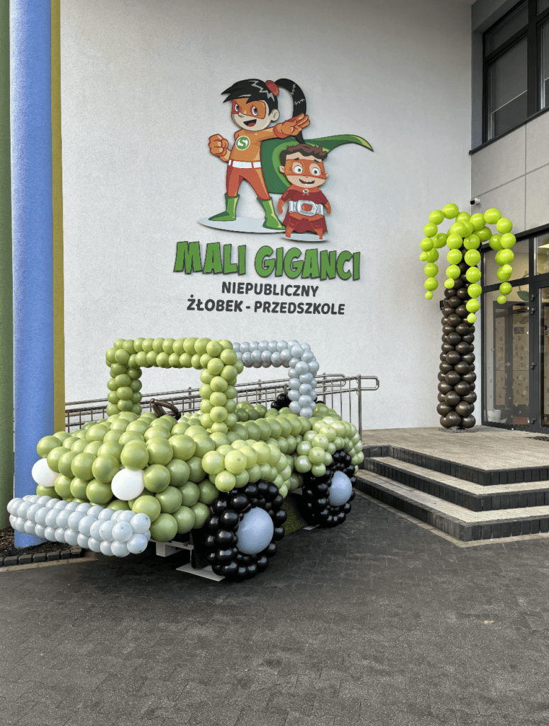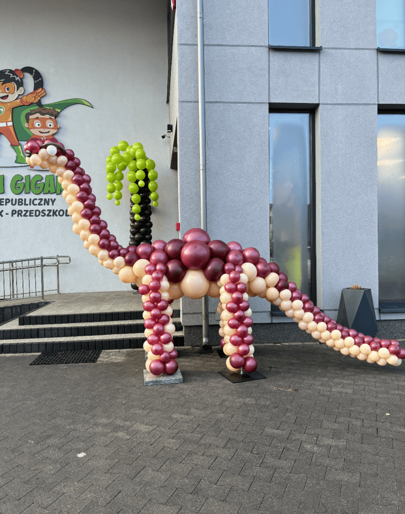Nasz potężny diplodok w odcieniach bordo i beżu stał się niekwestionowanym królem przedszkolnego podjazdu. 🌴 Tuż obok wyrosła wysoka, balonowa palma, pod którą zaparkował terenowy jeep – gotowy na każdą wyprawę badawczą! 🚗 Co ciekawe, auto zbudowane z setek oliwkowych balonów stało się ulubionym punktem przystankowym każdego małego odkrywcy.